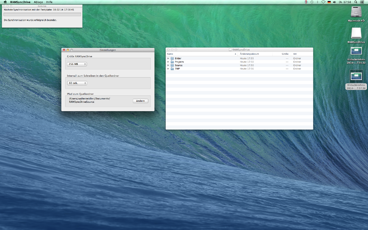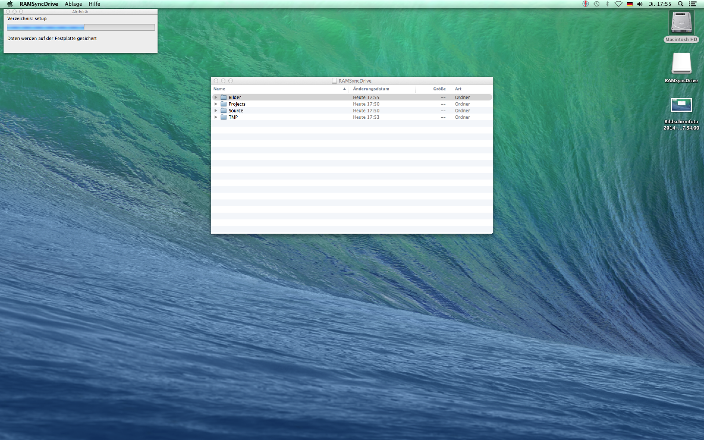 | | Willkommen zu RAMSyncDrive. Die persistente Ramdisk mit automatischer Synchronisation zu Ihrer Festplatte. Performance für Apps und Prozesse auf Ihrem Macintosh, kombiniert mit der Sicherheit einer Festplatte. Automatisch ohne weiteren Aufwand! Das Laufwerk kann einfach per USB-Stick auf einen anderen Rechner verwendet werden. |