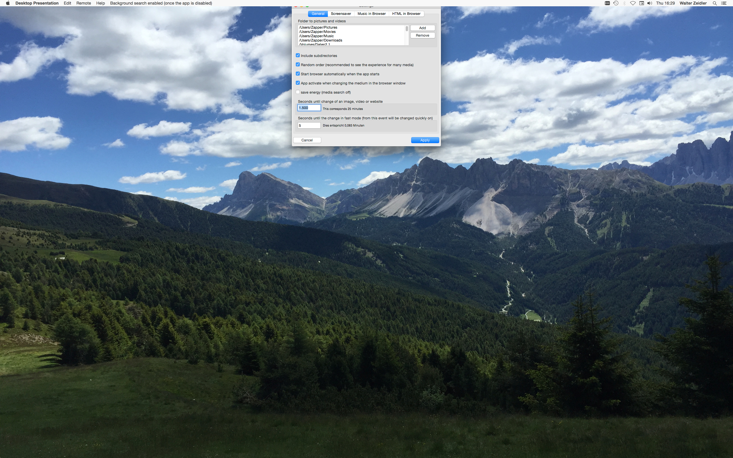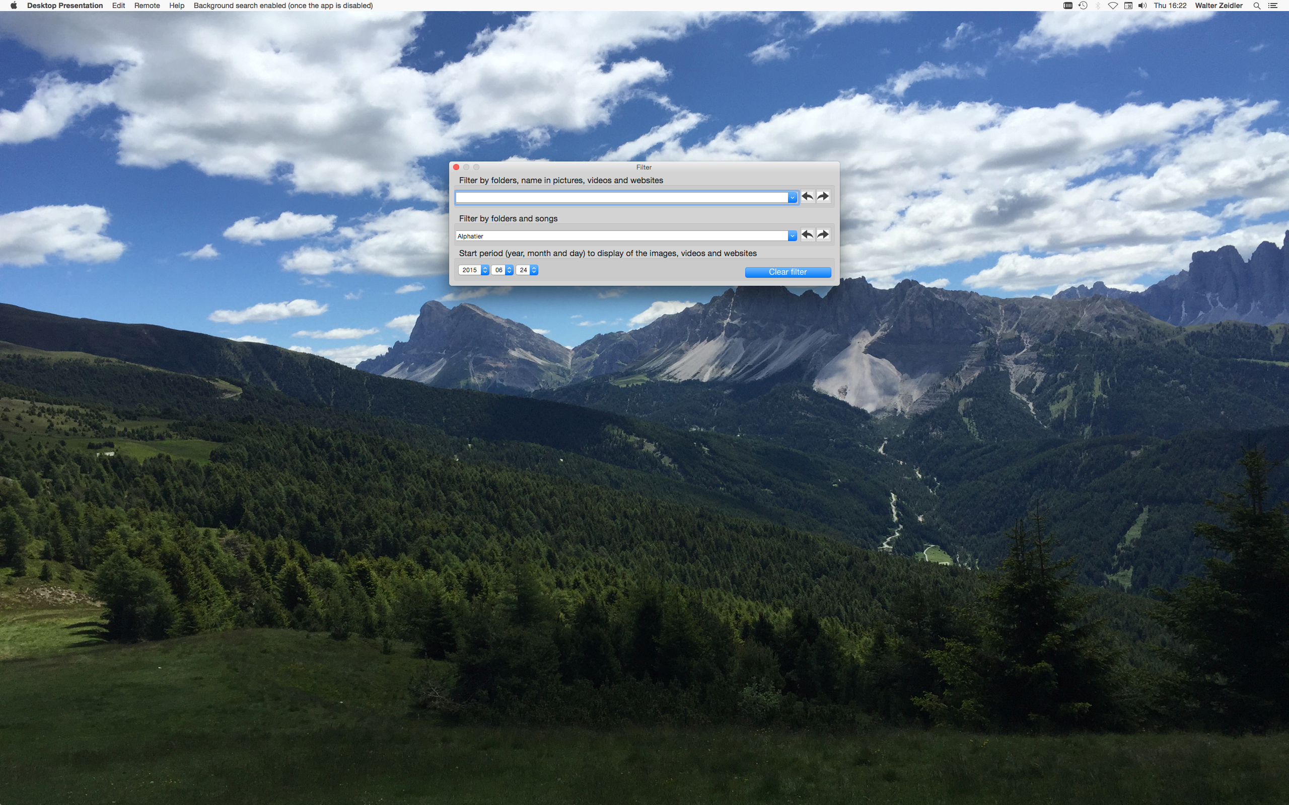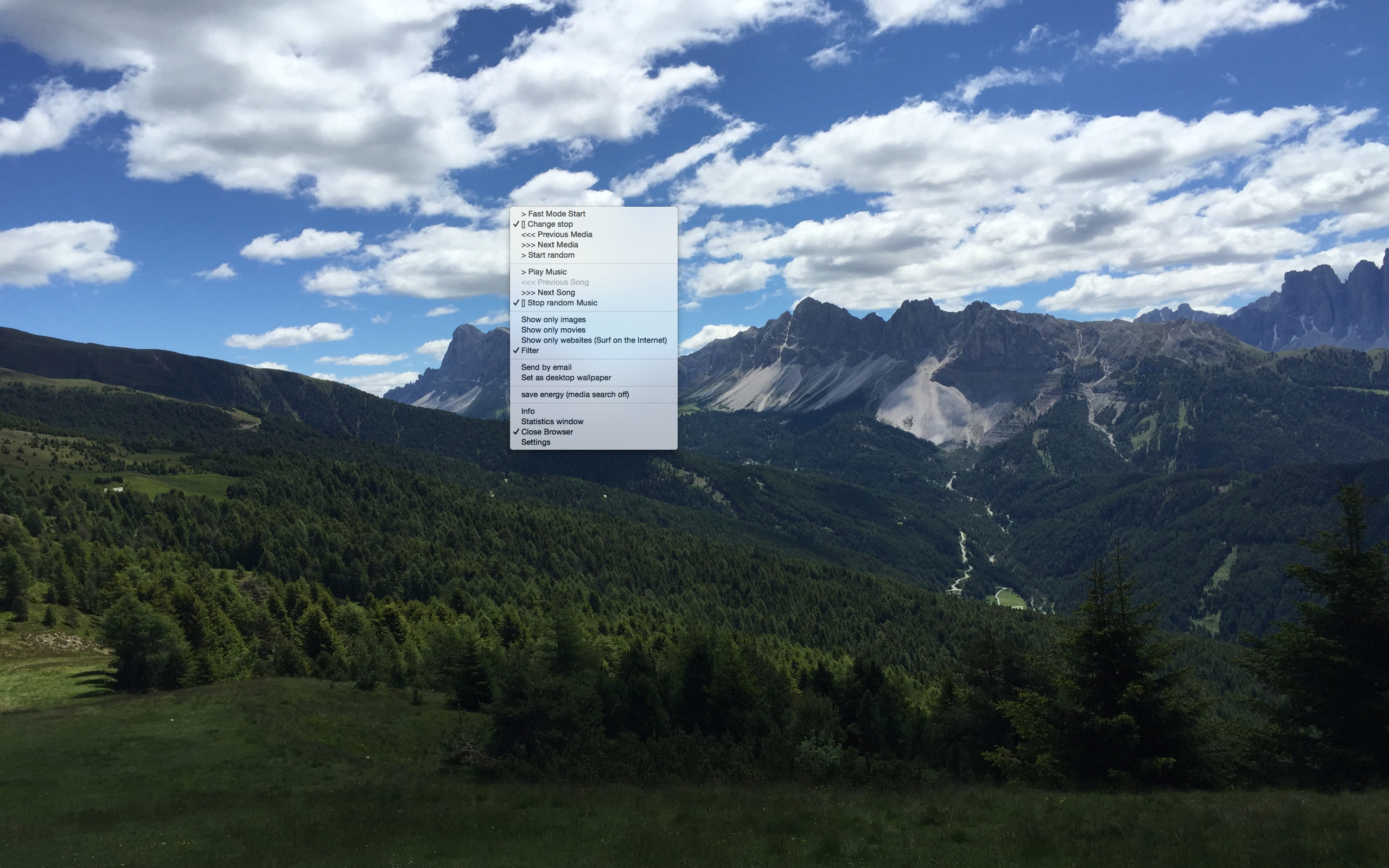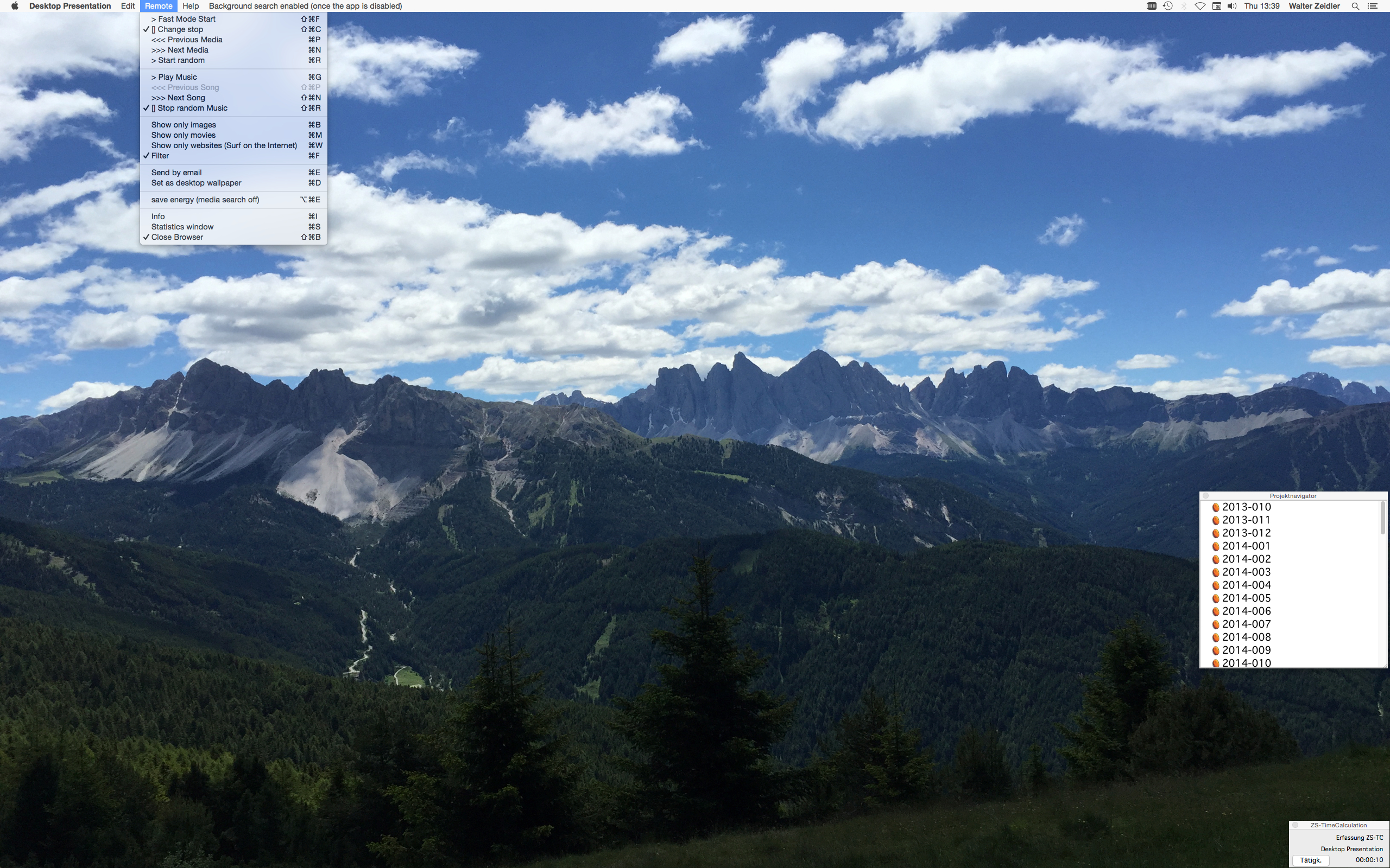 Your pictures, movies and music are on your Mac and often forgotten. Desktop Presentation gives you access to these media again. A picture or movie is shown in a desired interval. You can turn on your music.